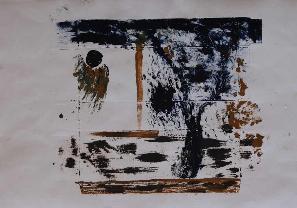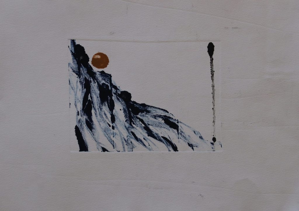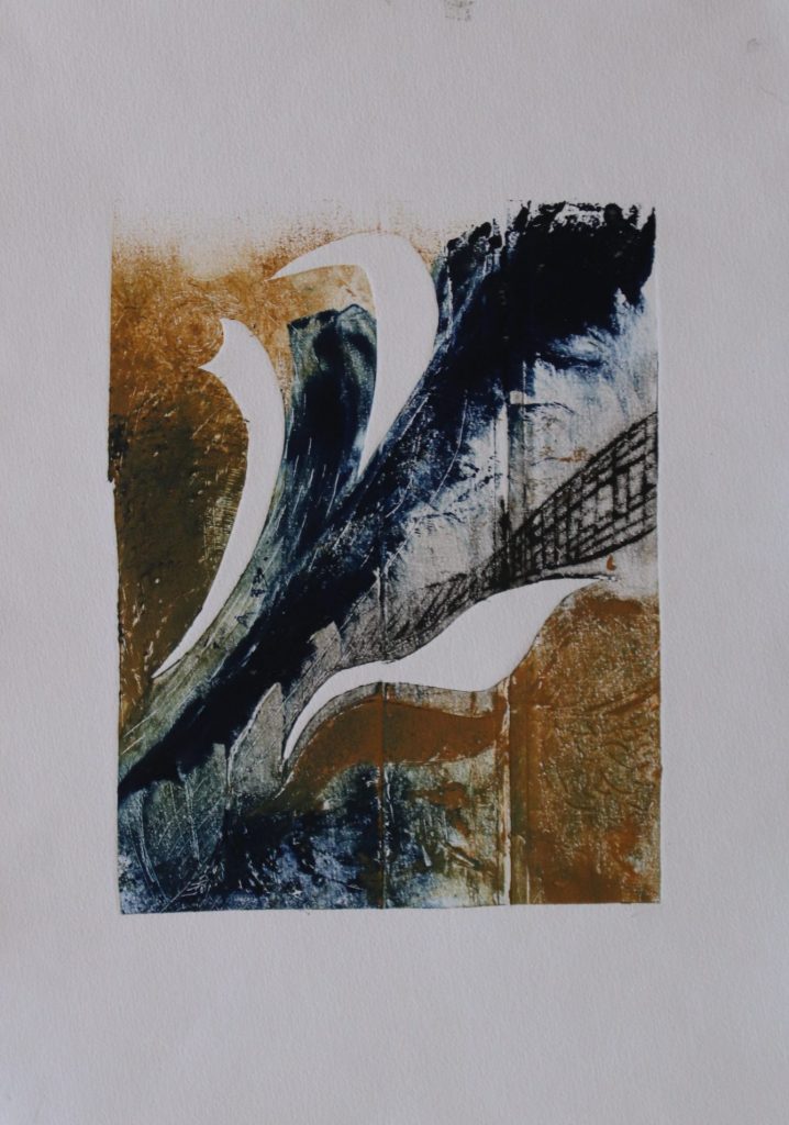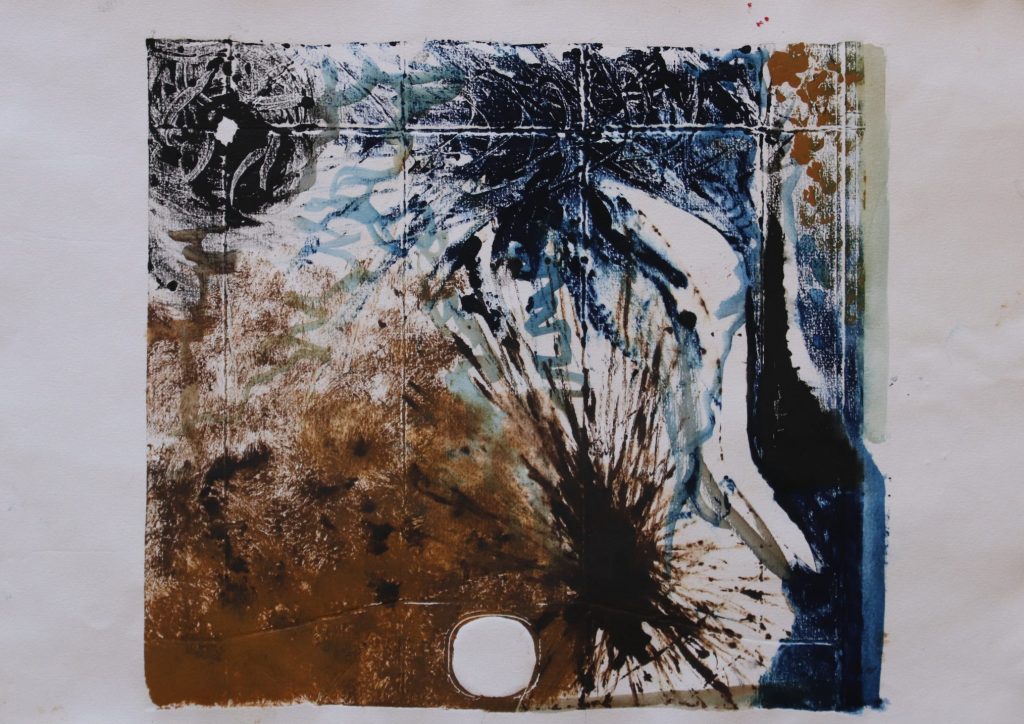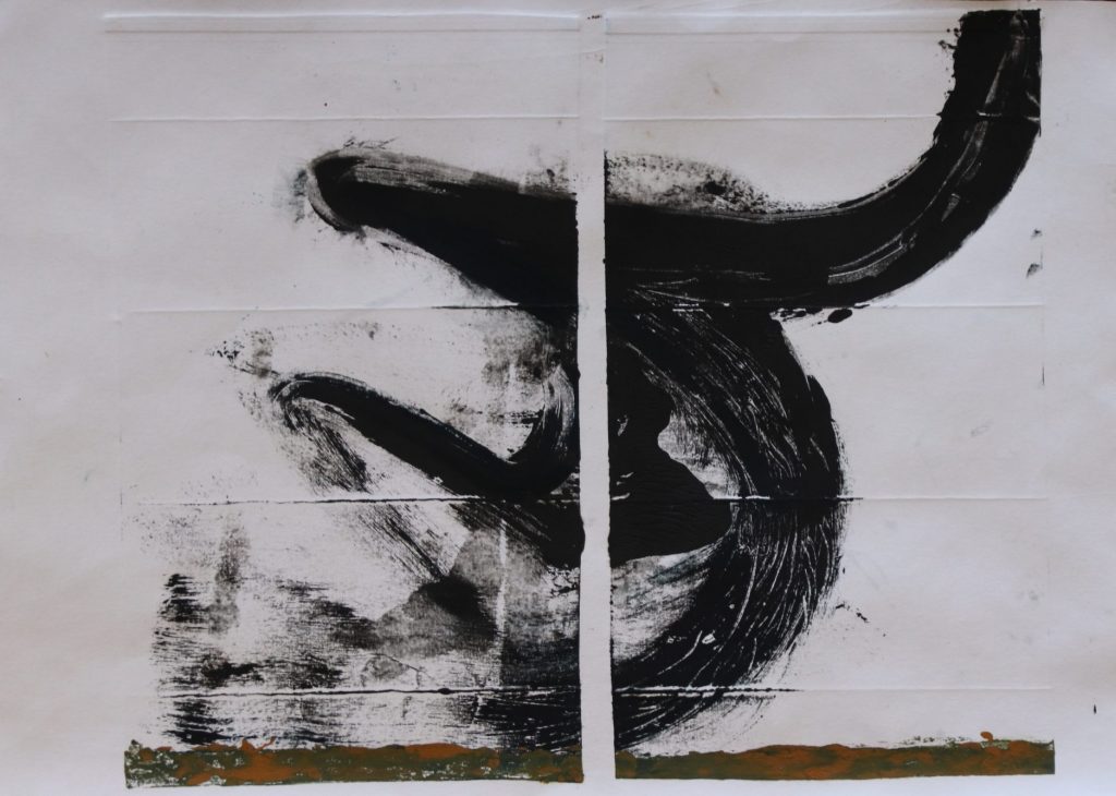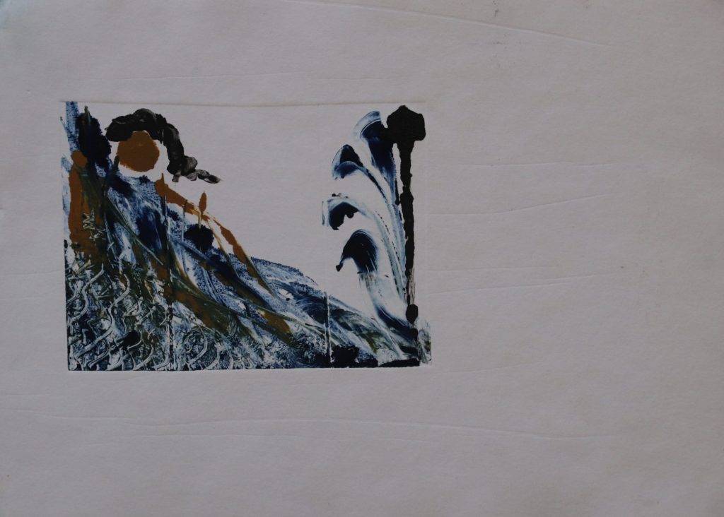 Pour un monotype c’est un peu la même chose, sauf qu’il n’y a pas de gravure, seulement le dépôt d’encre sur une plaque. Le geste y est libre, et peut être plus vaste, plus improvisé il n’y a pas la contrainte imposée par le procédé de gravure.